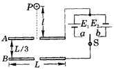 如图3-106所示,在密闭的真空中,正中间开有小孔的平行金属板A、B的长度均为L,两板间距离为L/3,电源E1、E2的电动势相同,将开关S置于a端,在距A板小孔正上方l处由静止释放一质量为m、电量为q的带正电小球P(可视为质点),小球P通过上、下孔时的速度之比为
