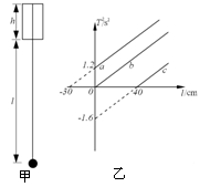 在“用单摆测定重力加速度”的实验中,将一单摆装置竖直悬于某一深度为h(未知)且开口向下的固定小筒中(单摆的下部分露于筒外),如图甲所示。将悬线拉离平衡位置一个小角度后由静止释放,设单摆摆动过程中悬线不会碰到筒壁。如果本实验的长度测量工具只能测量出筒下端口到摆球球心之间的距离l,并通过改变l 而测出对应的摆动周期T,再以T2 为纵轴、l 为横轴,作出T2 - l 图象,则可以由此图象得出我们想要测量的物理量。