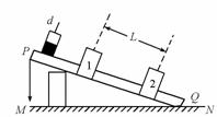 现利用如图所示装置测量滑块和长1m左右的木块间的动摩擦因数,图中MN是水平桌面,Q是木板与桌面的接触点,1和2是固定在木板上适当位置的两个光电门,与之连接的两个光电计时器没有画出。此外在木板顶端的P点还悬挂着一个铅锤,让滑块从木板的顶端滑下,光电门1、2各自连接的计时器显示的挡光时间分别为5.0×10-2s和2.0×10-2s。用游标卡尺测量小滑块的宽度d,卡尺数如图所示.