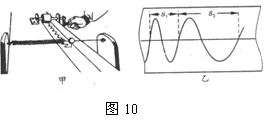 17(7)、某同学在进行“研究弹簧振子的周期和小球质量的关系”课题实验时,用如图10甲所示装置进行了如下的试验:让弹簧振子穿过一光滑的水平横杆,在弹簧振子的小球上安装一枝笔,下面放一条纸带,当小球振动时,垂直于振动方向以恒定的加速度拉动纸带,加速度的大小为a,这时笔在纸条上画出如图10乙所示的一条曲线,请根据图乙中所测得的长度S1、S2,写出计算弹簧振子振动周期的表达,T=_______________。