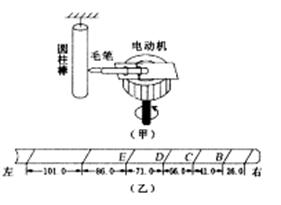 (8分)如图(甲)所示,用包有白纸的质量为 1 . 00kg 的圆柱棒替代纸带和重物,蘸有颜料的毛笔固定在电动机上并随之转动,使之替代打点计时器当烧断悬挂圆柱棒的线后,在圆柱棒竖直下落的过程中,毛笔就在圆柱棒面上的纸上画出记号,如图(乙)所示,设毛笔接触棒时不影响棒的运动.测得记号之间的距离依次为 26 . 0mm 、 41.0mm 、 56 .0mm 、 71 .0mm 、86.0mm 、 101.0mm ,已知电动机铭牌上标有“ 1500r /min ”字样,由此研究圆柱棒的运动情况:(1)毛笔画相邻两条线的时间间隔 T = s ,图(乙)中的圆柱棒的___ (选填“左”或“右”)端是悬挂端。(2)根据图(乙)所给的数据,计算毛笔画下记号C 时圆柱棒下落的速度Vc= ___ m/s