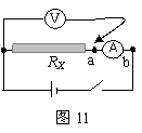 ⑵为提高金属丝电阻的测量精确度,减少误差,实验中需要确定电流表的内接或外接。由于表的内阻不清楚,一位同学采用了试触法进行判断。具体做法是:按如图11所示电路闭合开关后,用伏特表的移动端(弯曲部分)接到a点时,电压表示数为2.0v,电流表示数为0.40A;当移动端接到b点时,电压表示数为3.0V,电流表示数为0.38A.