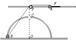 15.(12分)如图所示,在距水平地面高为0.4m处,水平固定一根长直光滑杆,在杆上P点固定一定滑轮,滑轮可绕水平轴无摩擦转动,在P点的右边,杆上套有一质量m=2kg小球A。半径R=0.3m的光滑半圆形细轨道,竖直地固定在地面上,其圆心O在P点的正下方,在轨道上套有一质量也为m=2kg的小球B。用一条不可伸长的柔软细绳,通过定滑轮将两小球连接起来。杆和半圆形轨道在同一竖直面内,两小球均可看作质点,且不计滑轮大小的影响,g取10m/s2。现给小球A一个水平向右的恒力F=55N。求: