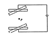 7.如图所示,两长平行金属板水平放置并接到电源上,一个带电微粒P位于两板间恰好平衡,现用外力将P固定,然后使两板各绕其中点转过α角,如图中虚线所示,撤去外力,则P在两板间