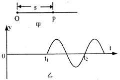 如图甲所示,O点为振源,OP=s。t=0时刻O点由平衡位置开始振动,产生向右沿直线传播的简谐横波。图乙为从t=0时刻开始描绘的P点的振动图象。下列判断中正确的是