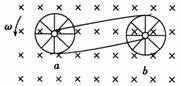 两个带有中心轴的金属圆圈a和b,其上都有多根辐向金属条,现用两根金属导线分别将自己的中心轴与对方的边缘接触,整套装置处于垂直纸面向里的匀强磁场中,如图所示.若圆圈a在外力作用下以恒定的角速度叫逆时针转动时,则圆圈b的转动情况是: