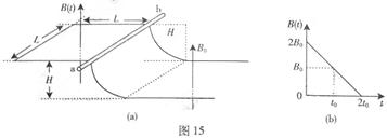16.(17分)如图15(a)所示,一端封闭的两条平行光滑导轨相距L,距左端L处的中间一段被弯成半径为H的1/4圆弧,导轨左右两段处于高度相差H的水平面上。圆弧导轨所在区域无磁场,右段区域存在磁场B0,左段区域存在均匀分布但随时间线性变化的磁场B(t),如图15(b)所示,两磁场方向均竖直向上。在圆弧顶端,放置一质量为m的金属棒ab,与导轨左段形成闭合回路,从金属棒下滑开始计时,经过时间t0滑到圆弧底端。设金属棒在回路中的电阻为R,导轨电阻不计,重力加速度为g。