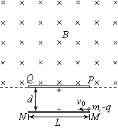(18分)如图所示,MN、PQ是平行金属板,板长为L,两板间距离为d,在PQ板的上方有垂直纸面向里的匀强磁场。一个电荷量为q、质量为m的带负电粒子以速度v0从MN板边缘沿平行于板的方向射入两板间,结果粒子恰好从PQ板左边缘飞进磁场,然后又恰好从PQ板的右边缘飞进电场。不计粒子重力。试求: