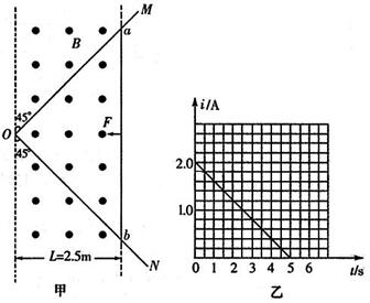 15.(12分)如图甲所示,垂直于水平桌面向上的有界匀强磁场,磁感应强度B=0.8T,宽度L=2.5m。光滑金属导轨OM、ON固定在桌面上,O点位于磁场的左边界,且OM、ON与磁场左边界均成45°角。金属棒ab放在导轨上,且与磁场的右边界重合。t=0时,ab在水平向左的外力F作用下匀速通过磁场。测得回路中的感应电流随时间变化的图象如图乙所示。已知OM、ON接触处的电阻为R,其余电阻不计。