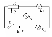 4. 如图所示,电路中电源的电动势为E、内电阻为r,开关S闭合后,当滑动变阻器的滑片P从滑动变阻器R的中点位置向左滑动时,小灯泡L1、L2、L3的亮度变化情况是: