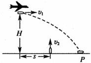 7. 如图所示,在一次地空演习中,离地H高处的飞机发射一颗炮弹,炮弹以水平速度v1飞出欲轰炸地面目标P,反应灵敏的地面拦截系统同时以速度v2竖直向上发射导弹进行拦截。设飞机发射炮弹时与拦截系统的水平距离为s,若拦截成功,不计空气阻力,则v1、v2的关系应满足: