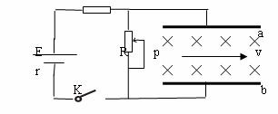 10.如图所示,电源电动势为E,内阻为r,滑动变阻器电阻为R,开关闭合。两平行极板间有匀强磁场,一带电粒子(不计重力)正好以速度v匀速穿过两板。以下说法正确的是: A. 保持开关闭合,将滑片p向上滑动一点,粒子将可能从下极板边缘射出 B. 保持开关闭合,将滑片p向下滑动一点,粒子将不可能从下极板边缘射出 C. 保持开关闭合,将a极板向下移动一点,粒子将继续沿直线穿出 D. 如果将开关断开,粒子将继续沿直线穿出