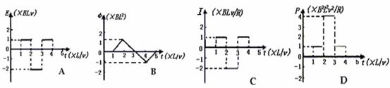 如图所示,一有界匀强磁场,磁感应强度大小均为B,方向分别垂直纸面向里和向外,磁场宽度均为L,在磁场区域的左侧相距为L处,有一边长为L的正方形导体线框,总电阻为R,且线框平面与磁场方向垂直。现使线框以速度v匀速穿过磁场区域。若以初始位置为计时起点,规定电流逆时针方向时的电流和电动势方向为正,B垂直纸面向里时为正,则以下关于线框中的感应电动势、磁通量、感应电流、和电功率的四个图象描述错误的是: