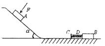 24.(19分)如图所示,粗糙斜面与光滑水平面通过半径可忽略的光滑小圆弧平滑连接,斜面倾角α=37°,A、B是两个质量均为 m=1㎏的小滑块(可视为质点),C为左端附有胶泥的质量不计的薄板,D为两端分别连接B和C的轻质弹簧.薄板、弹簧和滑块B均处于静止状态.当滑块A置于斜面上且受到大小F=4N,方向垂直斜面向下的恒力作用时,恰能向下匀速运动.现撤去F,让滑块A从斜面上距斜面底端L=1m处由静止下滑,若取g=10m/s2,sin37°=0.6,cos37°=0.8.