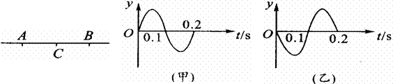如图所示,在一条直线上两个振动源A、B相距6m,振动频率相等.t0=0时刻A、B开始振动,且都只振动一个周期,振幅相等,其振动图象A为(甲),B为(乙)。若A向右传播的波与B向左传播的波在t1=0.3s时相遇,则