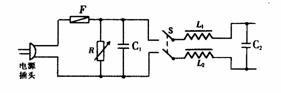 是两个电感线圈,它们的自感系数很大, F 是保险丝, R 是压敏电阻(正常情况下阻值很大,但电压超过设定值时,阻值会迅速变小,可以保护与其并联的元件) , C 1, C2