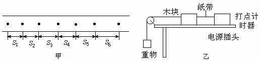 11.(6分) 在探究加速度与物体质量、物体受力的关系实验中,实验装置如图所示:一木块放在水平长木板上,左侧拴有一不可伸长的细软线,跨过固定在木板边缘的滑轮与一重物相连,重物的质量为m .木块右侧与穿过打点计时器的纸带相连,在重物牵引下,木块在木板上向左做匀加速运动.图甲给出了打点计时器在纸带上打出的一些连续的点,它们之间的距离分别为S1、S2、S3、S4、S5、S6,打点计时器所用交流电周期为T.根据给以上数据求: