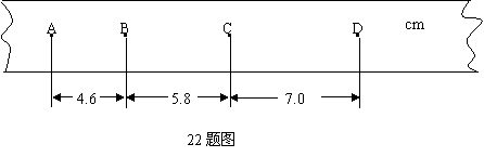 (2)(9分)在“研究匀变速直线运动的实验中”,从打出的纸带中选出A、B、C、D四个计数点,如图所示,测出AB=4.6cm,BC=5.8cm,CD=7.0cm,计数点的时间间隔为0.1 s,则AD间的平均速度为 ,打B点时物体的瞬时速度为 ,物体做匀变速直线运动的加速度a= .