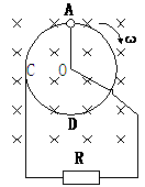 的金属小球,球套在环上,接触良好,另一端可绕环圆心O轴无摩擦转动。环与转轴间接有电阻R=2Ω,接点C与O在同一水平线上,其他导线与小球的电阻不计。匀强磁场垂直环面,磁感强度B=2T。现让金属球从环的最高点A处无初速顺时针滑下,当球运动到最低点D的瞬时角速度