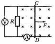 (16分)如图所示,长L=O. 80 m,电阻r=0. 30Ω,质量m=0. 10 kg的金属棒CD垂直放在水平导轨上,导轨由两条平行金属杆组成,已知金属杆表面光滑且电阻不计,导轨间距也是L,金属棒与导轨接触良好,量程为0-3. 0 A的电流表串联接在一条导轨上,在导轨左端接有阻值R=0. 50Ω的电阻,量程为0-1. 0 V的电压表接在电阻R两端,垂直于导轨平面的匀强磁场向下穿过导轨平面.现以向右恒定的外力F=1.6 N使金属棒向右运动,当金属棒以最大速度在导轨平面上匀速滑动时,观察到电路中的一个电表正好满偏,而另一个电表未满偏.