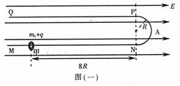 (1)将小环甲从N点左侧8R处由静止开始释放,如图(一),且知小环甲与直杆PQ间的动摩擦因数为μ(μ>0.5,且最大静摩擦力与滑动摩擦力大小相等),求小环甲在水平杆PQ上通过的路程.