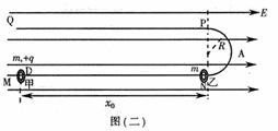 (2)若另一质量也为m、不带电的绝缘小环乙(视为质点)套在MN杆上的N点,如图(二),现从NM杆上的D点由静止释放小环甲,小环甲此后与乙碰撞时间极短,且碰后瞬间两者速度相同但不粘连, 乙环沿NAP运动到P点时刚好停止,求DN间的距离x0。