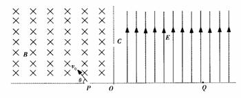 (20分)如图所示的区域中,左边为垂直纸面向里的匀强磁场,磁感应强度为B,右边是一个电场强度大小未知的匀强电场,其方向平行于OC且垂直于磁场方向。一个质量为m,电荷量为-q的带电粒子从P孔以初速度v0沿垂直于磁场方向进入匀强磁场中,初速度方向与边界线的夹角θ=60°,粒子恰好从C孔垂直于OC射入匀强电场,最后打在Q点,已知OQ=2OC,不计粒子的重力,求: