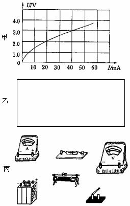③为验证这种元件的伏安特性曲线与厂家提供的是否相符,现用实物图丙中所示器材进行实验,其中电流表内阻为50Ω,电压表内阻为20kΩ,在图乙方框中画出实验电路图,并将实物图连接成实验电路。