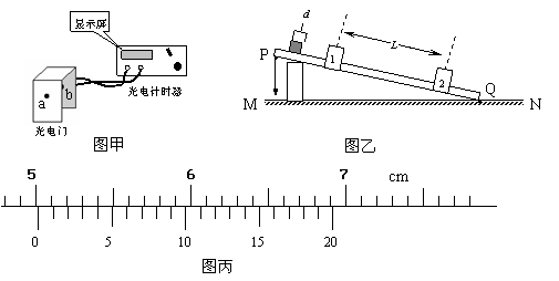现利用图乙所示装置测量滑块和1m长的木板间的动摩擦因数,图中MN是水平桌面,Q是木板与桌面的接触点,1和2是固定在木板适当位置的两个光电门,与之连接的两个光电计时器没有画出.此外在木板顶端的P点还悬挂着一个铅锤,让滑块从长木板的顶端滑下,光电门1、2各自连接的计时器显示的挡光时间分别为5.0×10-2s和2.0×10-2 s.用游标卡尺测量小滑块的宽度d,卡尺示数如图丙所示.