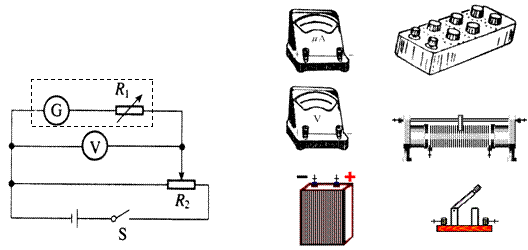 (3)现在把改装的电压表(虚线框内所示)跟标准电压表进行核对。实验电路图如下左图,按此电路图将所给实物连成测量电路。