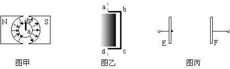 (2)如将此电压加在图丙所示的竖直放置的平行金属板上,且电动势为正时E板电势高,让一质量为m=6.4×10-13kg,电量为q=3.2×10-10C的带正电微粒从