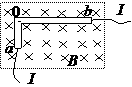 均匀直角金属杆aob可绕水平光滑轴o在竖直平面内转动,oa<ob。现加一水平方向的匀强磁场B并通以电流I,若撤去外力后恰能使直角金属杆ob部分保持水平,如图所示.则[