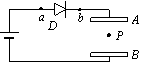 如图所示,D是一只理想二极管,具有单向导电性,在电路中的作用是只允许电流从a流向b,不允许电流从b流向a 。A、B是平行金属板,带电微粒P恰好位于两板正中央并保持静止状态。现将两极板间距稍稍增大一些(两极板仍保持平行),则微粒P的运动情况将是