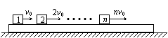 (18分)如图所示,一块足够长的木板,放在光滑水平面上,在木板上自左向右放有序号是1、2、3、…、n的木块,所有木块的质量均为m,与木板间的动摩擦因数都相同。开始时,木板静止不动,第l、2、3、…、n号木块的初速度分别为vo、2vo、3vo、…、nvo,vo方向向右,木板的质量与所有木块的总质量相等,木板足够长,最终所有木块与木板以共同速度匀速运动。试求:⑴所有木块与木板一起匀速运动的速度vn。⑵第1号木块与木板刚好相对静止时的速度v1。⑶第(n-1)号木块在整个运动过程中的最小速度vn-1。
