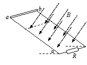 (20分)如图所示,足够长的光滑平行金属导轨,间距为L=2.0m,导轨平面与水平方向成α=30°角。导轨下部接有一只阻值为R=5.0Ω的电阻。现将一个长也是L=2.0m,质量为m=0.20kg的金属棒自导轨顶部从静止开始沿导轨自由下滑。下滑一段距离后进入一个垂直于导轨平面向下的匀强磁场中,磁感应强度B=0.50T,该磁场下部无边界。金属棒进入磁场后又下滑了s´=30m后开始做匀速运动。在做匀速运动之前,电阻R上产生的电热是60J。金属导轨和金属棒的电阻不计。求:⑴金属棒进入磁场后当速度为v=15m/s时的加速度大小和方向。⑵磁场的上边界到导轨顶部的距离。