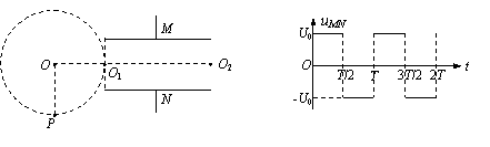 24.(20分)如图所示,在真空中,半径为b的虚线所围的圆形区域内存在匀强磁场,磁场方向垂直纸面向外。在磁场右侧有一对平行金属板M和N,两板间距离也为b,板长为2b。两板的中心线O1O2与磁场区域的圆心O在同一直线上,两板左端与O1也在同一直线上。有一电荷量为q、质量为m的带正电粒子,以速率v0从圆周上的P点沿垂直于半径O O1并指向圆心O的方向进入磁场,当它从圆周上的O1点飞出磁场时,给M、N板加上如右图所示的电压uMN。最后粒子刚好以平行于N板的速度,从N板的边缘飞出。不计平行金属板两端的边缘效应及粒子所受的重力。⑴求磁场的磁感应强度B的大小;⑵求交变电压的周期T和电压U0的值;⑶若t=T/2时刻,将该粒子从M、N板右侧沿板的中心线O2 O1,仍以速率v0射入M、N之间,求粒子从磁场中射出的点Q到P点的距离。