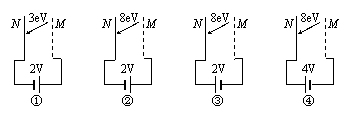 17.如图所示,N为钨板,M为金属网,它们分别和电池两极相连,各电池的极性和电动势在图中标出。钨的逸出功为4.5eV。现分别用能量不同的光子照射钨板(各光子的能量在图上标出)。那么,下列图中有光电子到达金属网的是