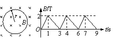 22.在周期性变化的匀强磁场区域内,有垂直于磁场放置的匝数n=20的闭合圆形线圈,其半径为r=1.0m、单位长度的电阻为ρ=0.50Ω/m。磁感应强度B按图示规律变化。求:⑴t=2.0s末线圈中的感应电动势的瞬时值E2和线圈中感应电流的瞬时值I2的大小和方向;⑵画出0~9s内感应电流i随时间变化的图象(以逆时针方向为正)。⑶任意1.0分钟内线圈中产生的焦耳热Q。(计算结果均保留2位有效数字)