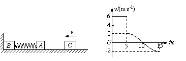 如下左图所示,物体A、B的质量分别是4.0kg和6.0kg,用轻弹簧相连结放在光滑的水平面上,物体B左侧与竖直墙相接触。另有一个物体C从t=0时刻起以一定速度向左运动,在t=5.0s时刻与物体A相碰,并立即与A粘在一起不再分开。物块C的v-t图象如下右图所示。求:⑴物块C的质量;⑵墙壁对物体B的弹力F在5.0s到10s的时间内对B做的功W和在5.0s到15s的时间内对B的冲量I的大小和方向;⑶B离开墙后弹簧具有的最大弹性势能Ep。