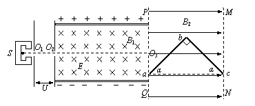 如图所示,粒子源S可以不断地产生质量为m、电荷量为+q的粒子(重力不计)。粒子从O1孔漂进一个水平方向的加速电场(初速不计),再经小孔O2进入相互正交的匀强电场和匀强磁场区域,电场强度大小为E,磁感应强度大小为B1,方向如图。虚线PQ、MN之间存在着水平向右的匀强磁场,磁场范围足够大,磁感应强度大小为B2。一块折成直角的硬质塑料片abc(不带电,宽度、厚度都很小可以忽略不计)放置在PQ、MN之间,截面图如图,a、c两点分别位于PQ、MN上,ab=bc=L,α= 45º。粒子能沿图中虚线O2O3的延长线进入PQ、MN之间的区域。⑴求加速电压U1;⑵假设粒子与硬质塑料板相碰后,速度大小不变,方向变化遵守光的反射定律,那么粒子与塑料片第一次相碰后到第二次相碰前做什么运动?⑶粒子在PQ、MN之间的区域中运动的总时间t和总路程s分别是多少?