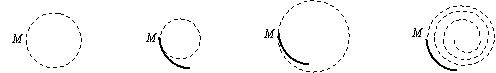 一个不计重力的带电粒子在匀强磁场中做匀速圆周运动。当它运动到M点时,恰好与一个原来不带电的静止粒子碰撞,在瞬间合为一体。那么它们碰撞后的轨迹应该是下列四图中的哪一个(实线是碰前的轨迹,虚线是碰后的轨迹。)