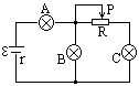 如图所示电路中,当变阻器R的滑动片P向左滑动时,A、B、C三个灯亮度变化情况是[ ]