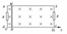 R,其余部分电阻不计。导线框一长边与x轴重合,左边的坐标x = 0,线框内有一垂直于线框平面的匀强磁场,磁场的磁感应强度为B。一质量为m、电阻也为R的光滑导体棒MN与短边平行且与长边接触良好。开始时导体棒静止于x =