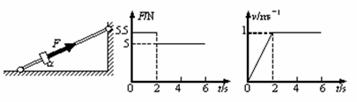 固定光滑细杆与地面成一定倾角,在杆上套有一个光滑小环,小环在沿杆方向的推力F作用下向上运动,推力F与小环速度v随时间变化规律如图所示,取重力加速度g=10m/s2。求: