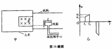 14、(12分).铁路上使用一种电磁装置向控制中心传输信号以获取火车运动信息,能产生磁感应强度为B的匀强磁场的装置,被安装在火车首节车厢下面,如图甲所示(俯视图)。当它经过安放在两铁轨间的线圈时,线圈便会产生一电信号,传输给控制中心,线圈长为L宽为b,匝数为n,线圈和传输线的电阻忽略不计。若火车通过线圈时,控制中心接收到的线圈两端的电压信号u与时间t的关系如图乙所示,同: