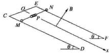 19(18分)如图所示,光滑的平行金属导轨CD与EF间距为L=1m,与水平夹角为θ=300,导轨上端用导线CE连接(导轨和连接线电阻不计),导轨处在磁感应强度为B=0.1T、方向垂直于导轨平面向上的匀强磁场中.一根电阻为R=lΩ 的金属棒MN两端有导电小轮搁在两导轨上,棒上有吸水装置P.取沿导轨向下为x轴正方向,坐标原点在CE中点.开始时棒处在x=0位置(即与CE重合),棒的起始质量不计.当棒自静止起下滑时,便开始吸水,质量逐渐增大,设棒质量的增大与位移x的平方根成正比,即 ,k为一常数, .求:
