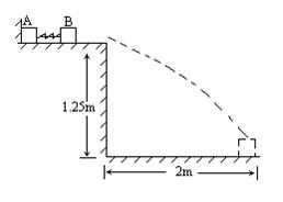 如图所示,高出地面1.25m的光滑平台上,靠墙放着质量为4kg的物体A,用手把质量为2kg的物体B经轻质弹簧压向物体A,保持静止(弹簧与A、B不系牢),此时弹簧具有的弹性势能是100),在A和B之间系一细绳,细绳的长度大于弹簧的自然长度,放手之后,物体B向右运动,把细绳拉断,物体B落在离平台水平距离为2m的地面上,求: