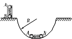 如图所示,质量相等为m的两球AB间有压缩的弹簧处于锁定状态,当竖直放置在水平面的光滑的发射管内,解除锁定时,A球能上升的最大高度为H,现在让两球包括锁定的弹簧从水平面出发,沿光滑的半径为R的半圆槽由静止开始下滑(他们整体视为质点),至最低点时,瞬间锁定解除,求A球离开圆槽后能上升的最大高度。