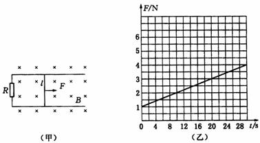 19.(10分)如图(甲)所示,一对平行光滑轨道放置在水平面上,两轨道间距l=0.20m,电阻R=1.0W;有一导体杆静止地放在轨道上,与两轨道垂直,杆及轨道的电阻皆可忽略不计,整个装置处于磁感强度B=0.50 T的匀强磁场中,磁场方向垂直轨道面向下,现用一外力F沿轨道方向拉杆,使之做匀加速运动,测得力F与时间t的关系如图(乙)所示,求杆的质量m和加速度a.