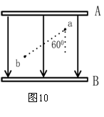 (12分) A、B两平行金属板间的匀强电场的场强E=2×105N/C,方向如图10所示,电场中a、b两点相距10cm,ab连线与电场线成60° 角,a点距A板3cm,b点距B板4cm,以b点电势为零电势点。问:(1)A、B两板间电势差UAB多大?
